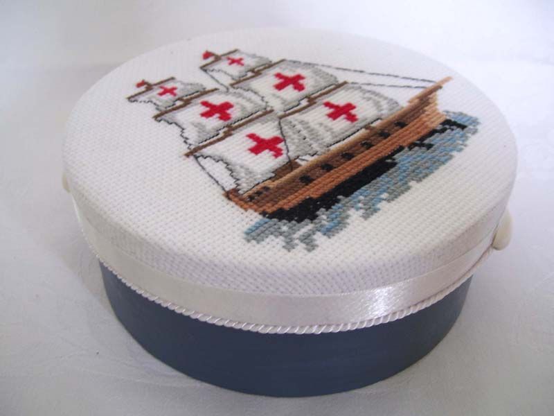 Hímzett doboz hajó mintával és kagylókkal.